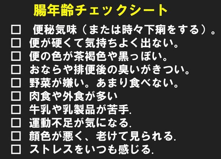 腸内細菌の状態が加齢によって変化することは「腸年齢の老化」と呼ばれます。辨野さんは、手軽に腸年齢がわかる「腸年齢チェックシート」を作りました。「便秘気味か。おならが臭いか。野菜が嫌いであまり食べないか。運動不足が気になるか」といった10項目です。