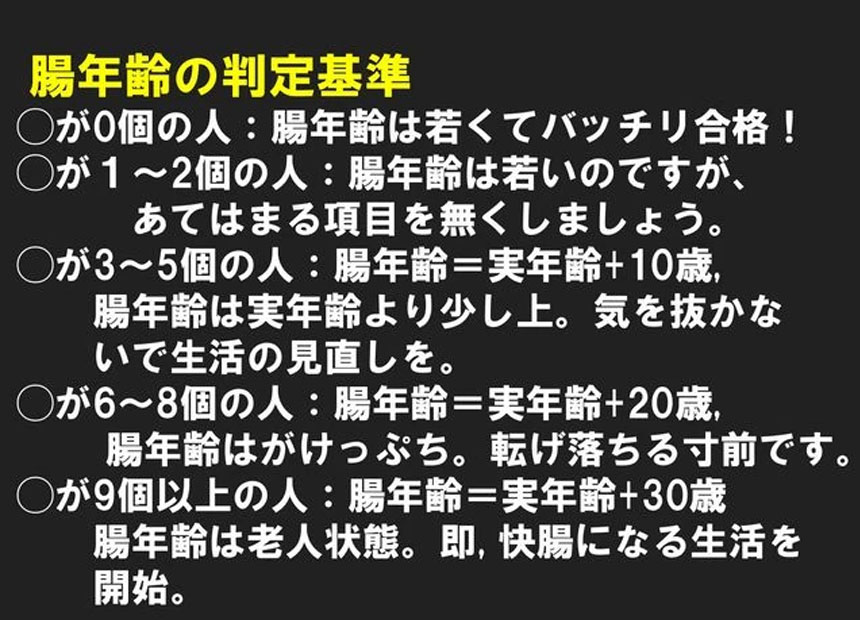 「10項目のうち、あてはまるものがゼロであるのがベスト。6~8個ある人の腸年齢は『実年齢+20歳』で計算され、いわば、がけっぷちです。さらに、9個以上の人の腸年齢は『実年齢+30歳』なので老人状態。ただちに生活を改善し、『快腸』になる取り組みを始めましょう」と辨野さん。