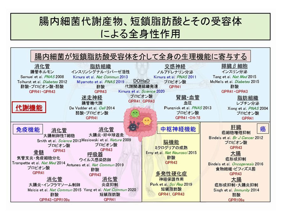 短鎖脂肪酸とは何か。木村さんは「腸内細菌が食物繊維などを発酵させて作る物質」とし、エネルギー源になるだけでなく、血流にのって全身に運ばれ、さまざまな臓器の生理機能を活性化していると説明しました。さらに、そのメカニズムについて「短鎖脂肪酸が体内で特定の受容体と結びつき、ホルモン分泌や免疫力などに作用していることが最近の研究でわかってきた」と述べました。