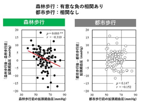 さらに、森林浴には身体の生理機能を調整する効果があることも分かりました。92名による15分間の森林歩行によって、高血圧の人の血圧が低下するだけでなく、低血圧の人の血圧は上昇したのです(図2)。同じ人が都市を15分歩いても、このような効果はありませんでした。私たちは、森林浴が血圧を正常値に向かわせる効果を「生体調整効果」と名付けました。