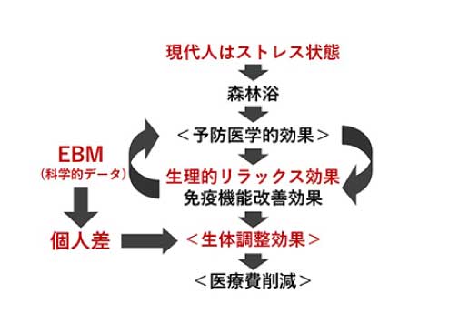 私は、2003年に「科学的なエビデンスを持った森林浴」を意味する「森林セラピー」を提唱しました。2018年までの「森林セラピー基地構想」における実験により、森林環境下では人の身体に以下のような変化が起きることを明らかにし、リラックス効果が得られることを解明しました。