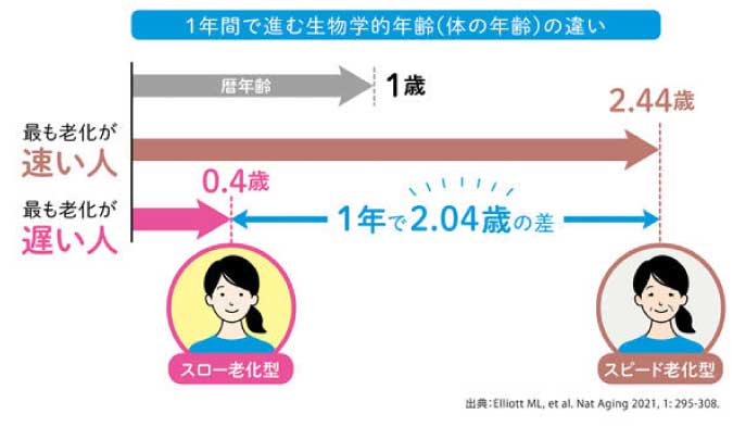 例えば、ニュージーランドで行われた研究で、約1,037人を20年間追跡したところ、同じ年齢の人でも、1年で体が0.4歳しか老けない人もいれば、2.44歳分も老化が進んでしまう人もいるということが確認されました。つまり、老化の進み具合に最大2歳以上の開きが出たということです。この老化の進み具合は「PoA(ピー・オー・エー)」と呼ばれています。